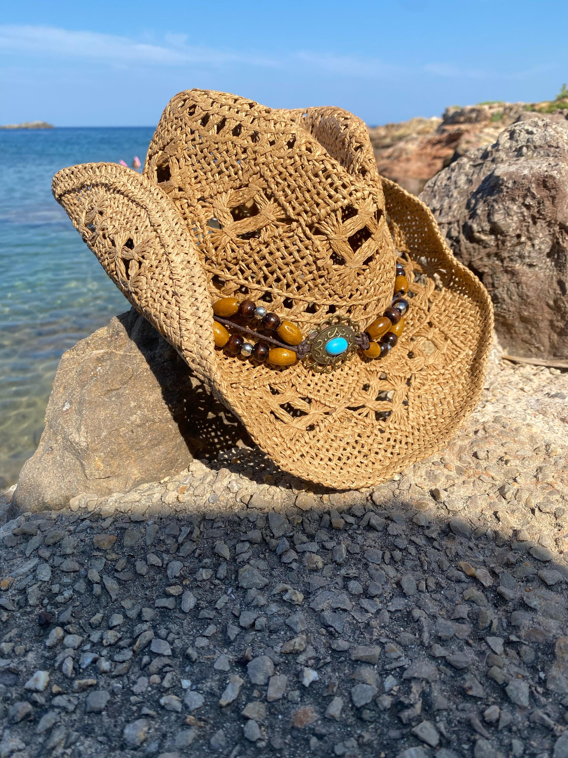 Designed to keep you cool while turning heads, it’s your go-to accessory for festival season, poolside lounging, or that spontaneous boat day. Whether you're riding waves or riding the vibe, this hat brings a touch of wild west flair to your Balearic wardrobe.