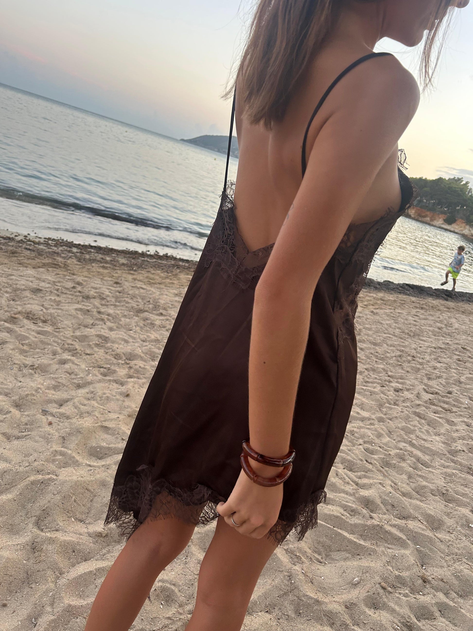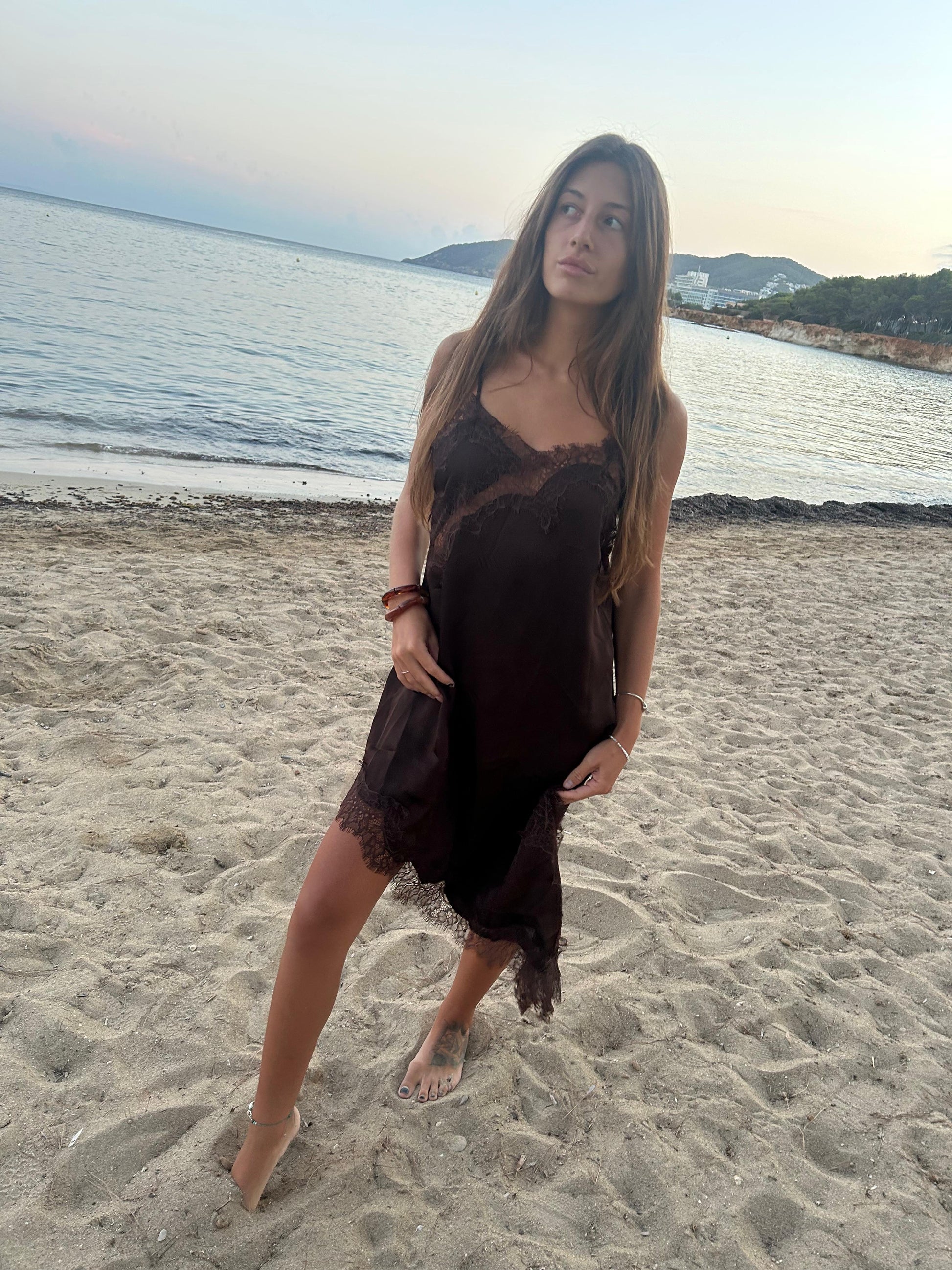 Lose yourself in the magic of island nights with The Midnight Muse. Crafted from flowing chocolate silk, this asymmetric slip dress whispers effortless sensuality with every movement. Delicate lace trims trace its silhouette, adding a touch of romance to its free-spirited elegance.