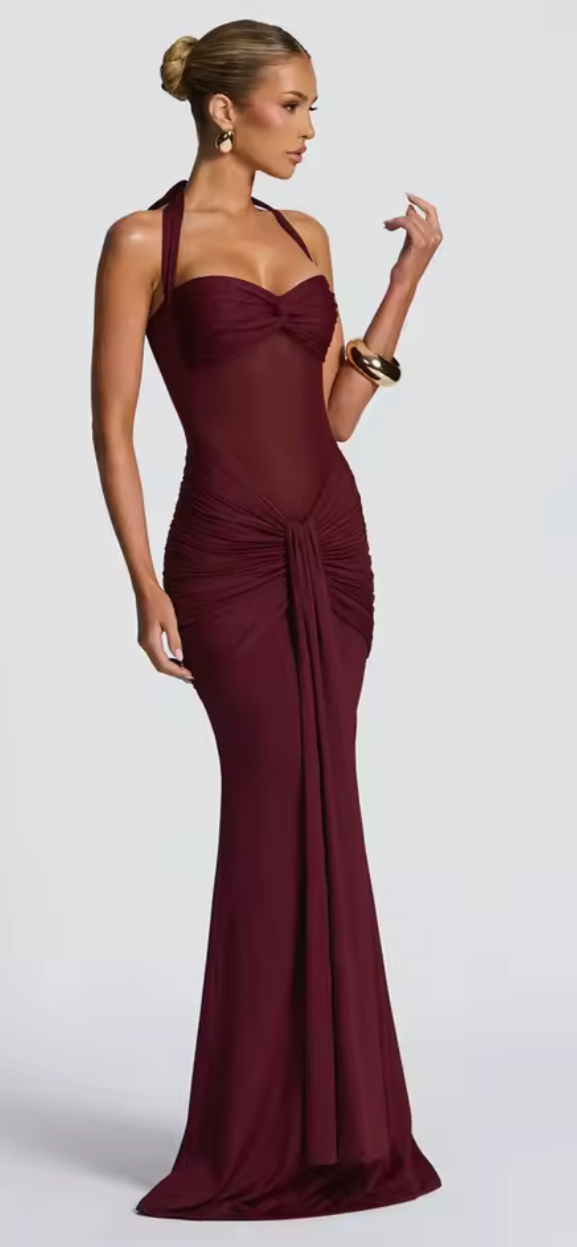 Indulge in the elegance of midnight with the Noir Sirena Sheer Ruched Halter Gown, a signature statement of refined seduction by Ibizakisses. Crafted to contour the feminine form, this gown features a sculpted twist-front halter neckline that frames the décolletage with effortless allure.
